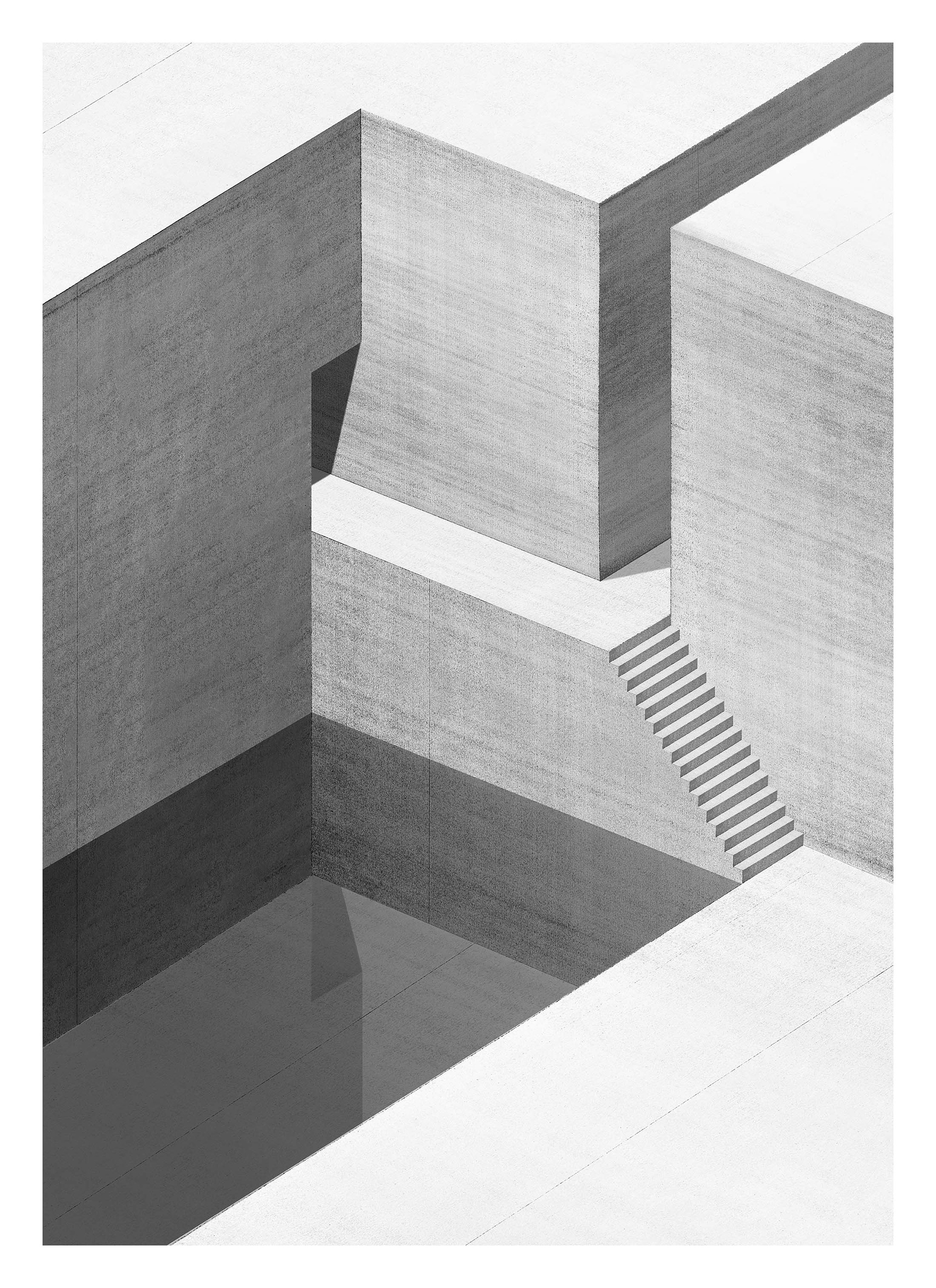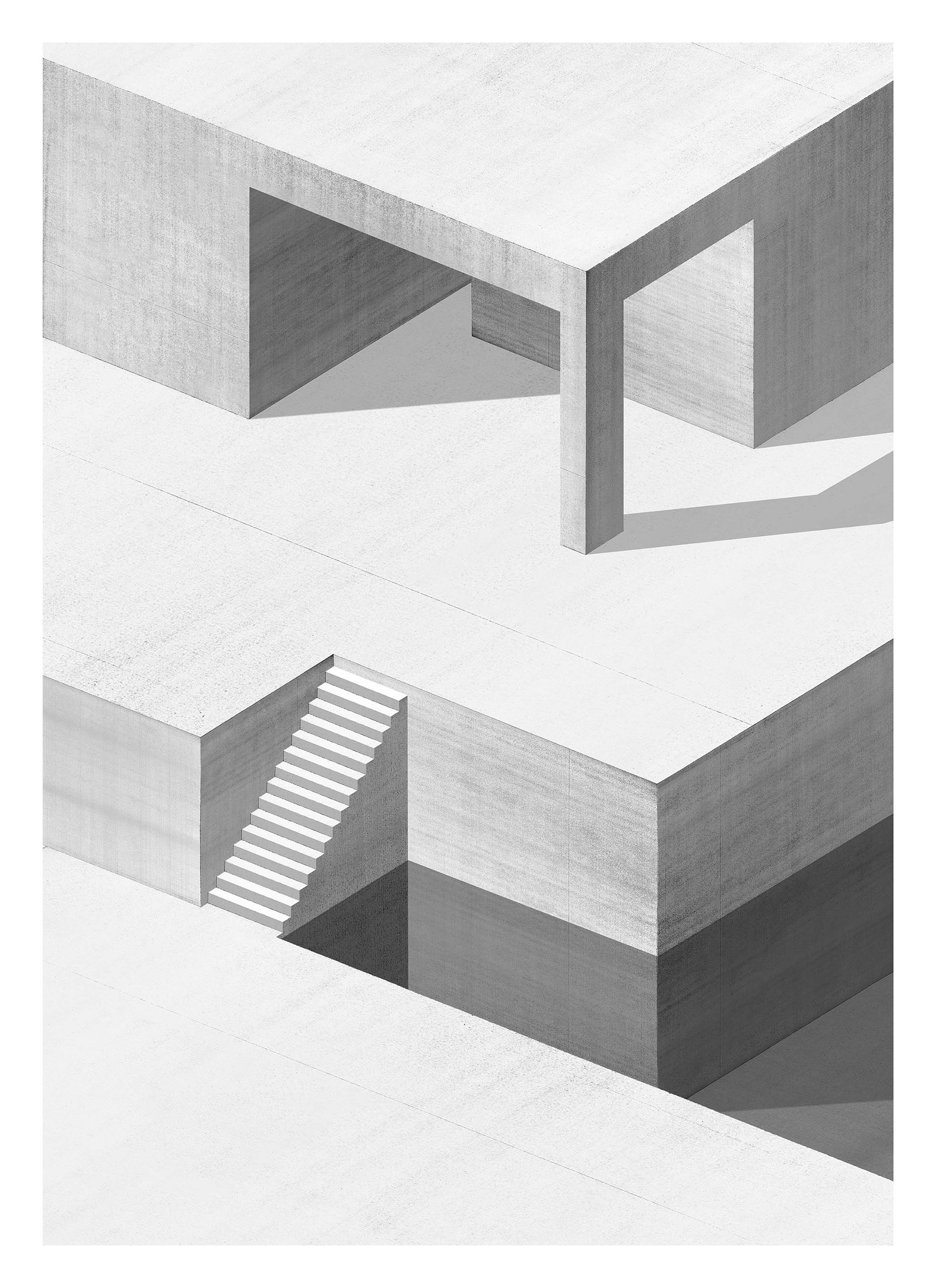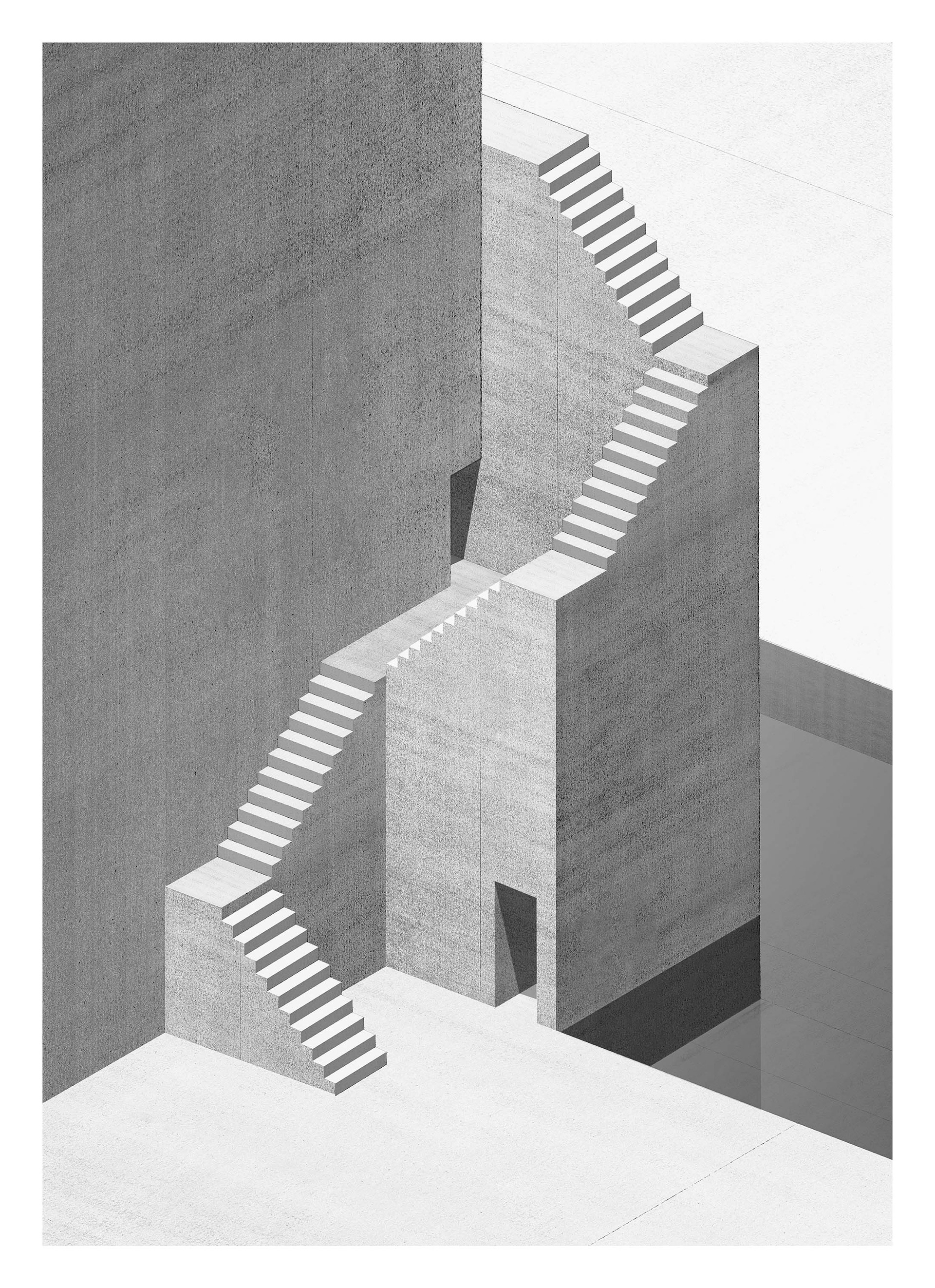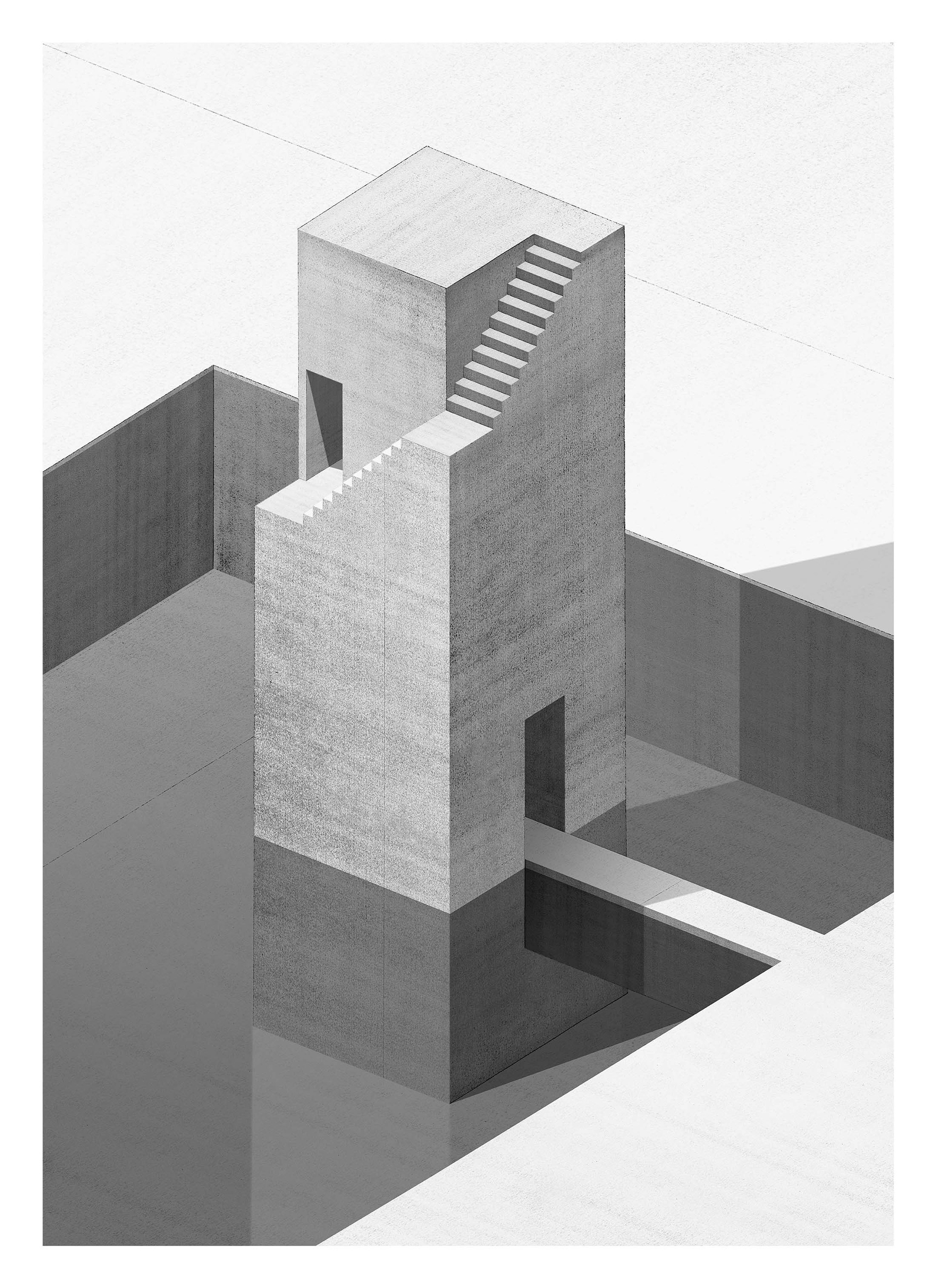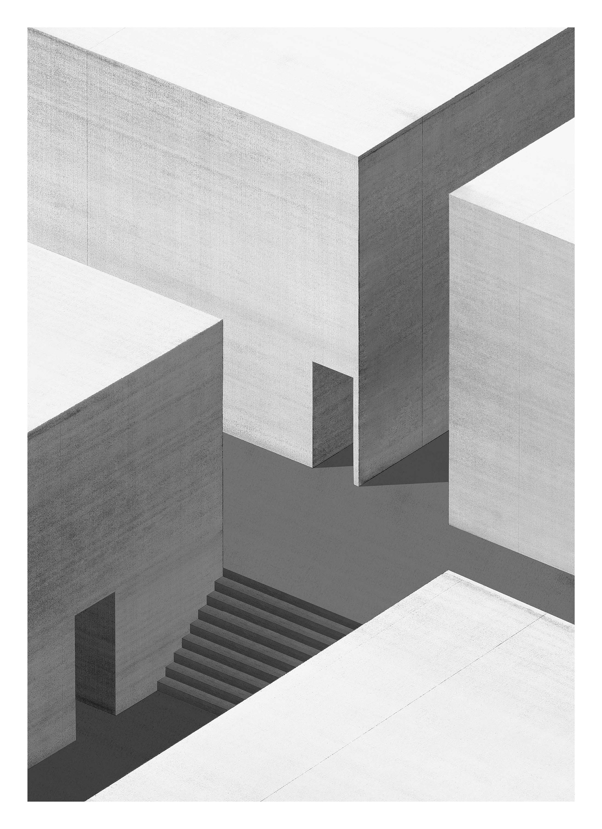 Walls and stairs remain in an uninhabited city.